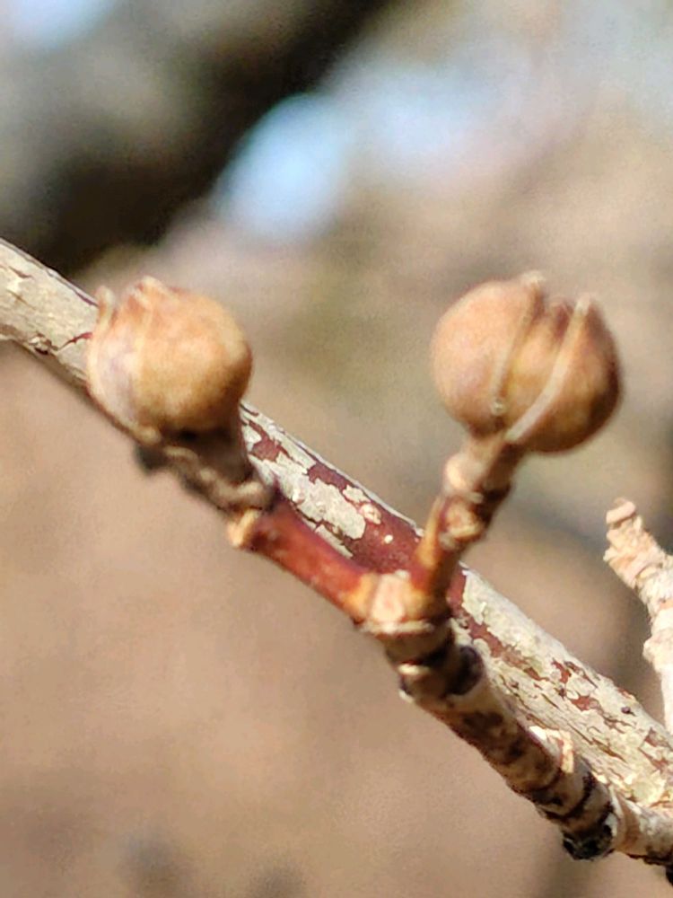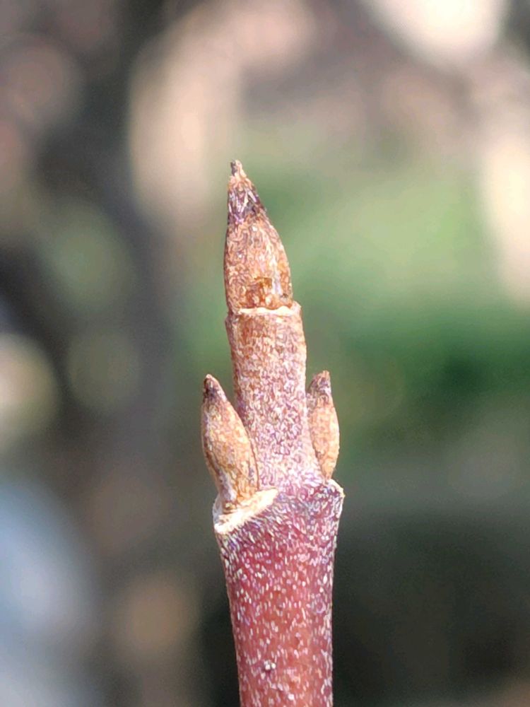 短枝の先についた丸い冬芽は花芽で、4枚の総苞片に包まれている。(②)
