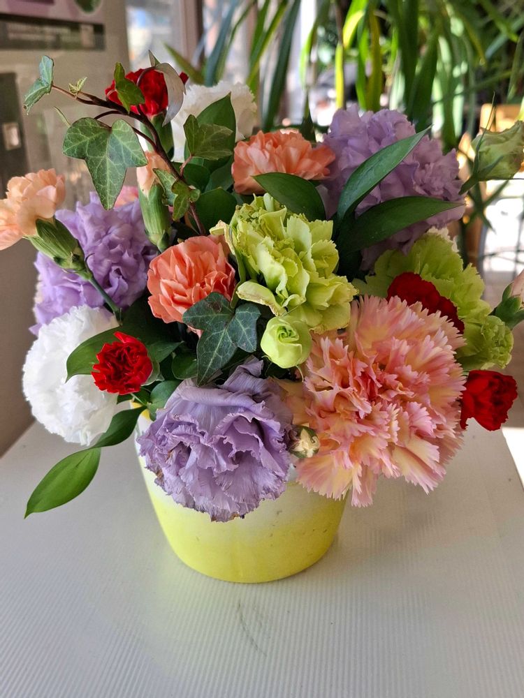 素敵な色合い、カーネーションが主体ですね、薔薇も入って素敵💓