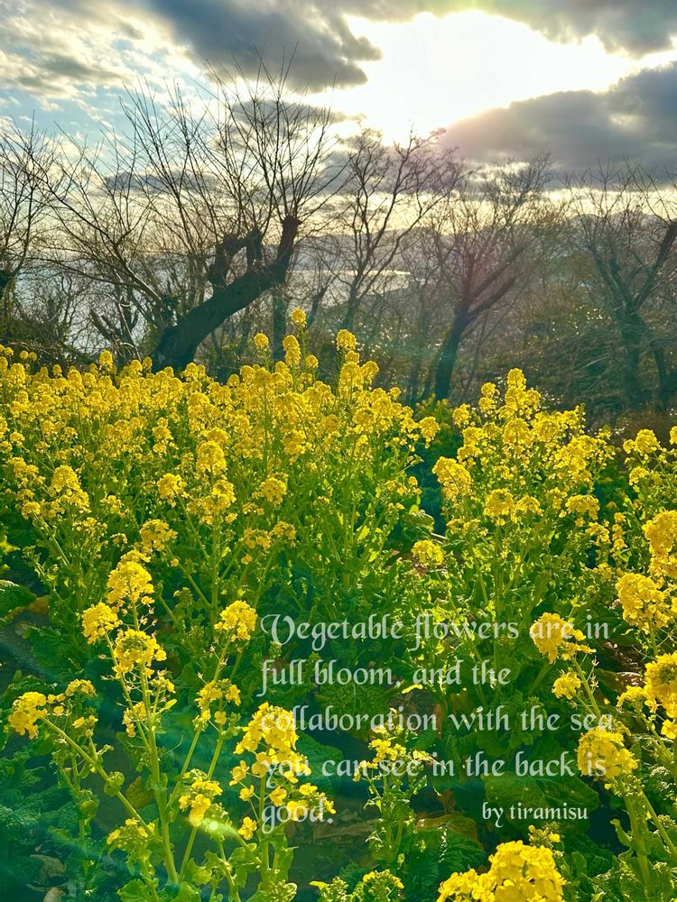 菜の花がもう咲いてるの?向こうに海や富士山が見えるなんて絶好のロケーションだね🗻⛵️🏵️