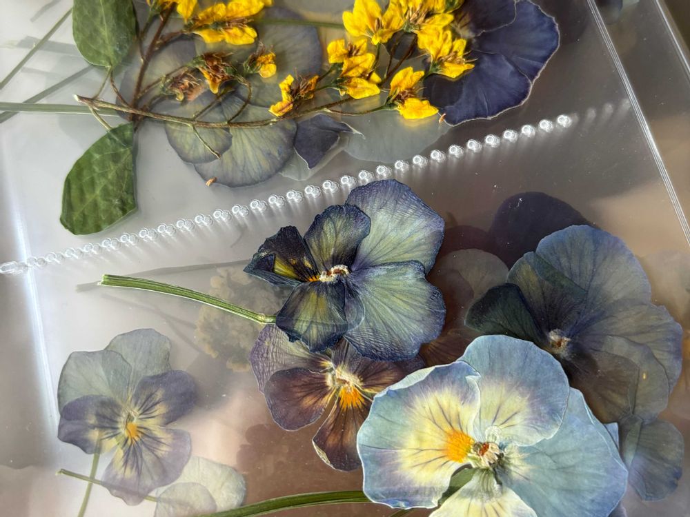 押し花を追加する。前に押した花も綺麗に仕上がったのでクリアファイルに納める。こうする事で裏側の絶妙な色味も楽しめるのだ。