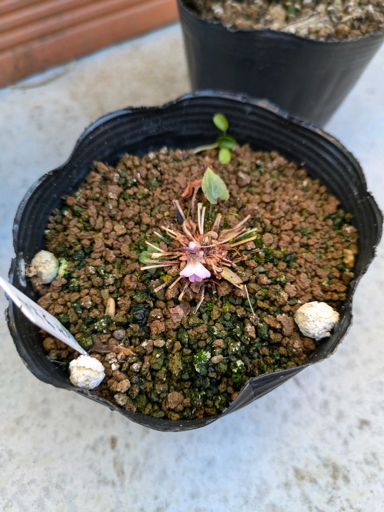 先月、晴れ続きで水やりを忘れてしまい葉が全部枯れたピンク色のナゾスミレ。