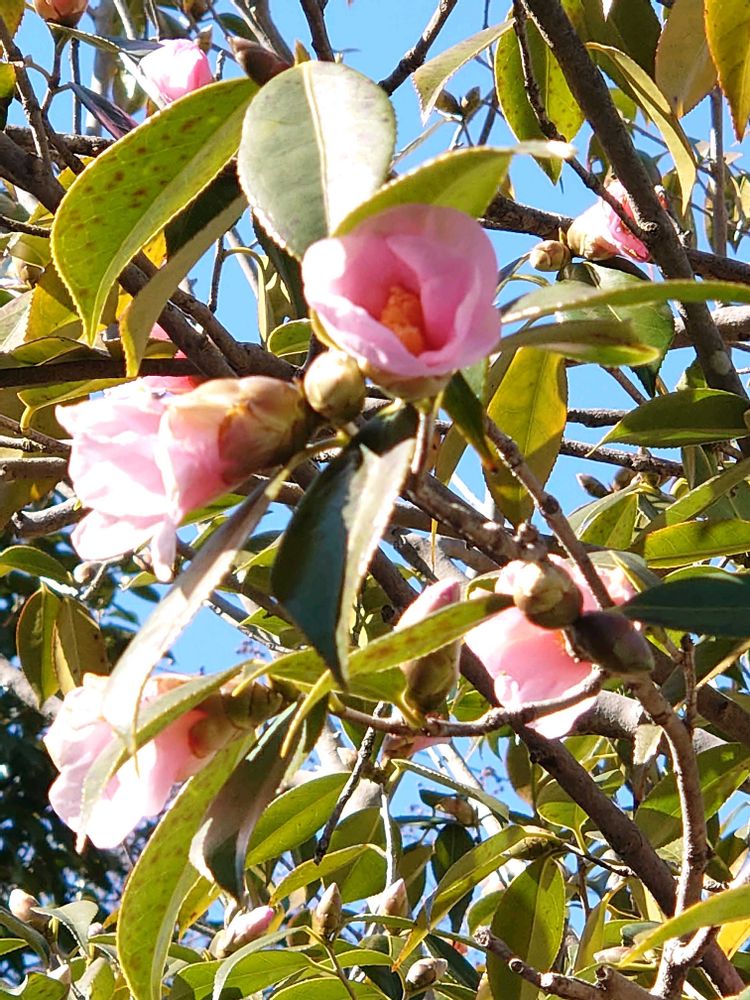 この公園には赤に白の斑入りの椿がありますが、まだ固い蕾😌 近くにこの可愛い椿を見つけました🩷😃