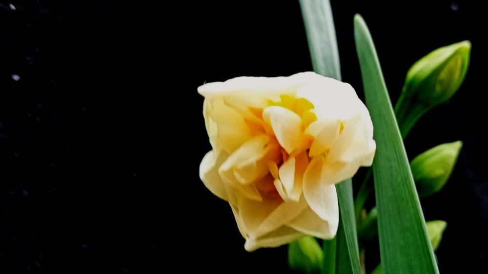 1月初旬に蕾を付けた「八重咲き水仙」が今朝、開花しました