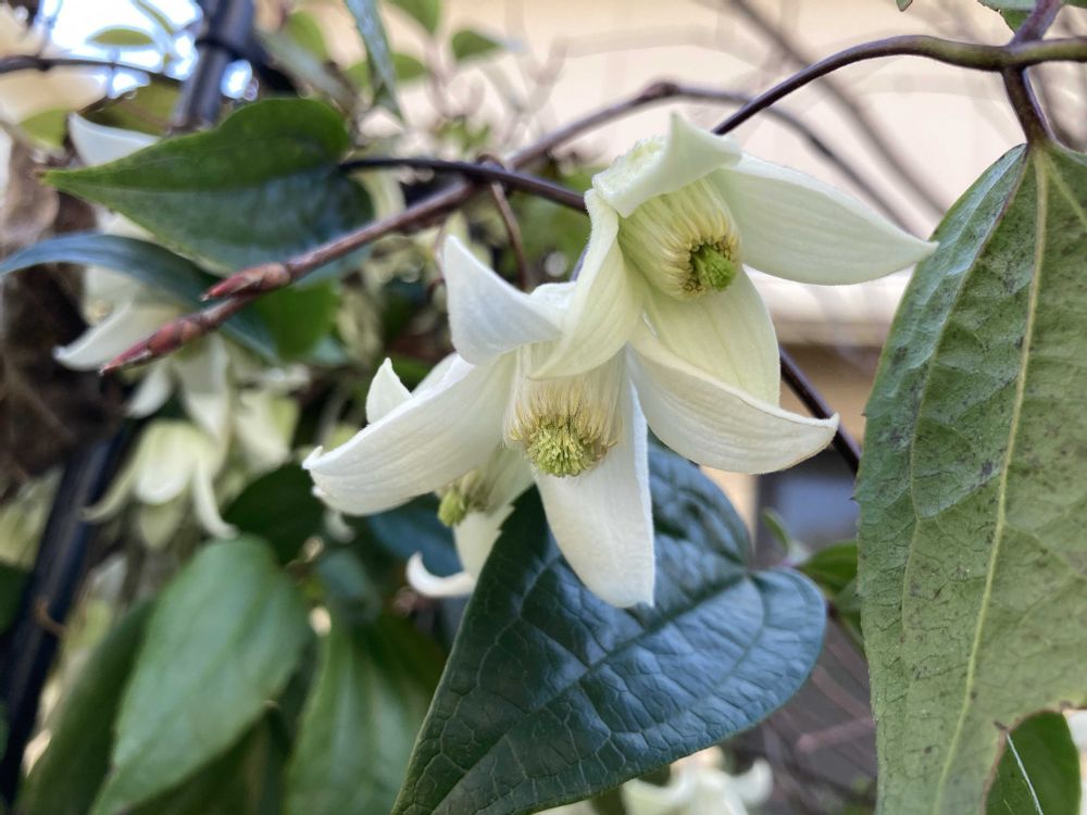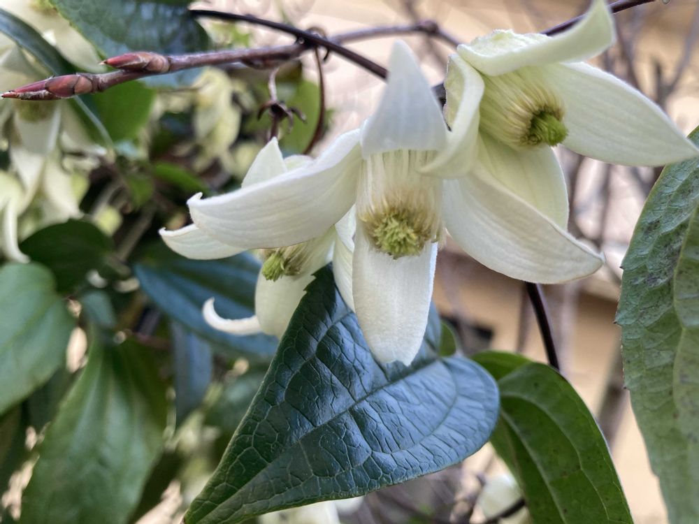 庭のフェンスに絡まるクレマチスが、白い花で🤍🌱冬の音楽を奏でています。🎶