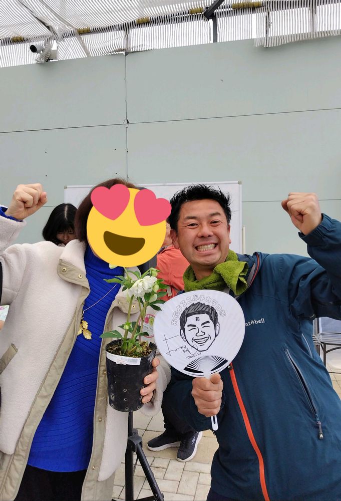 横山さんの真っ白いプリマドレス等2種と、他に童仙房さんのお花1種を購入🥰、横山さんと力こぶ💪ポーズで記念写真を撮らせていただきました。