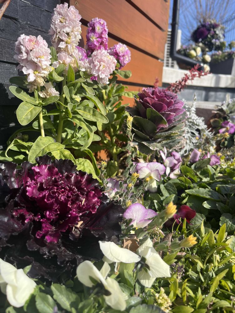 小さな花壇に植えたハボタンとストック、パンジーがとてもきれいです✨