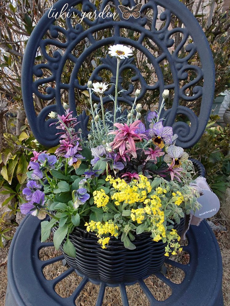 石村あさみさんのビオラ『旅する蝶』が、菜の花のような黄色いアリッサム『サミット』やローダンセマム『アフリカンアイズ』の中をひらひら自由に飛び回り、春の訪れを告げている様子をイメージしました🦋🧡🤍