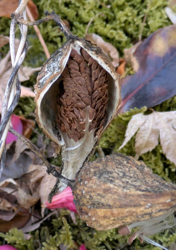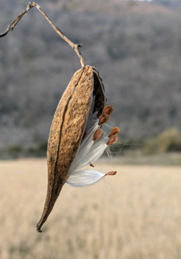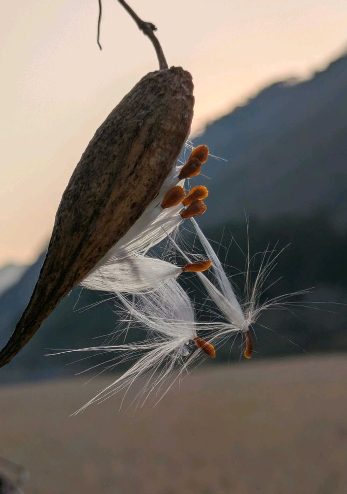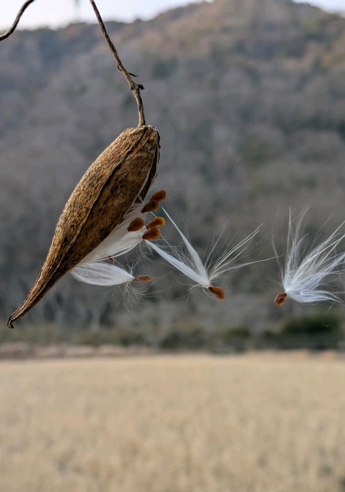縦に割れた実から、ケサランパサランが旅立っていく つる巻き月曜日🏷 綿毛は種髪と呼ばれ風に乗る🤎