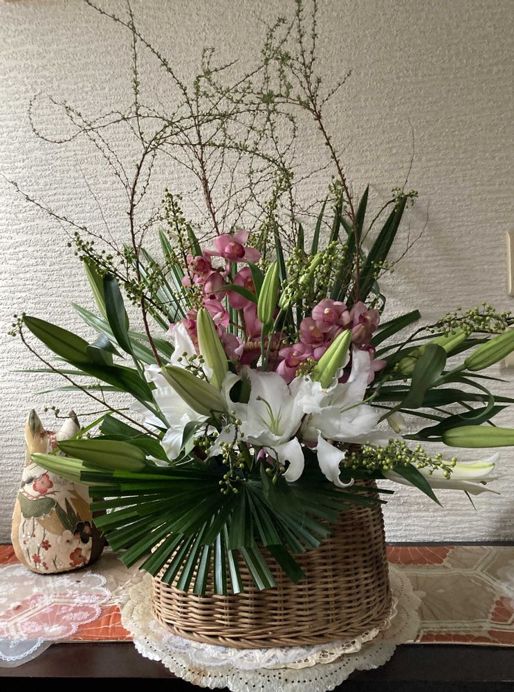 シンビジュームをいただいたのでユリ、アオモジ、ユキヤナギを買い足してアレンジしました