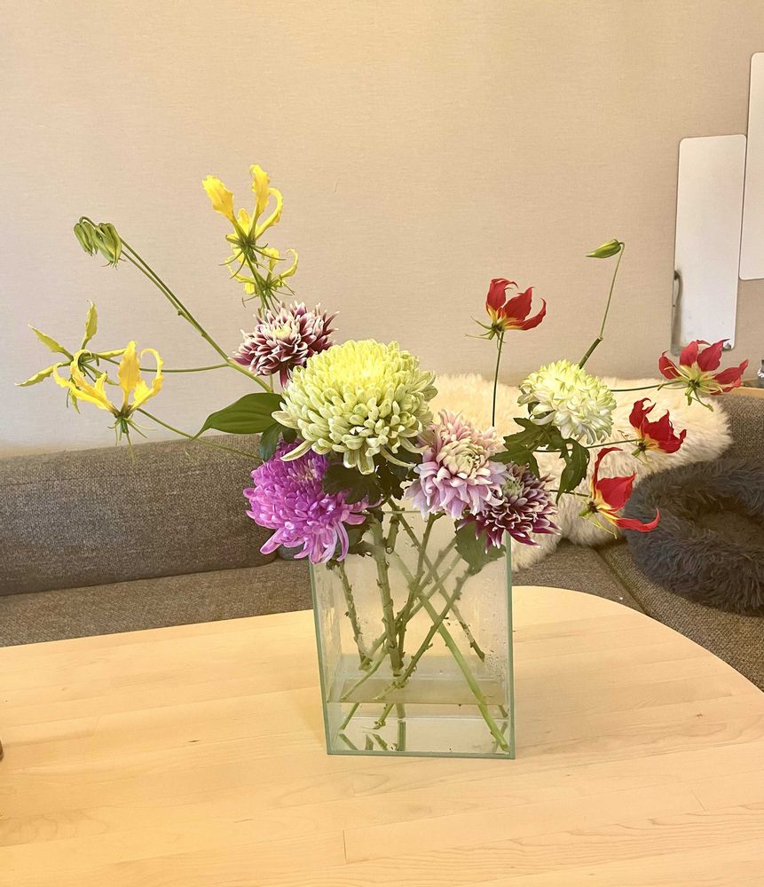 何種類もの素敵なお花が溢れてました。お花は選ぶ時も帰り道も生けても観ても癒されますね。小さな花瓶しか持ってなかったので観賞魚用の水槽に生けました(笑)