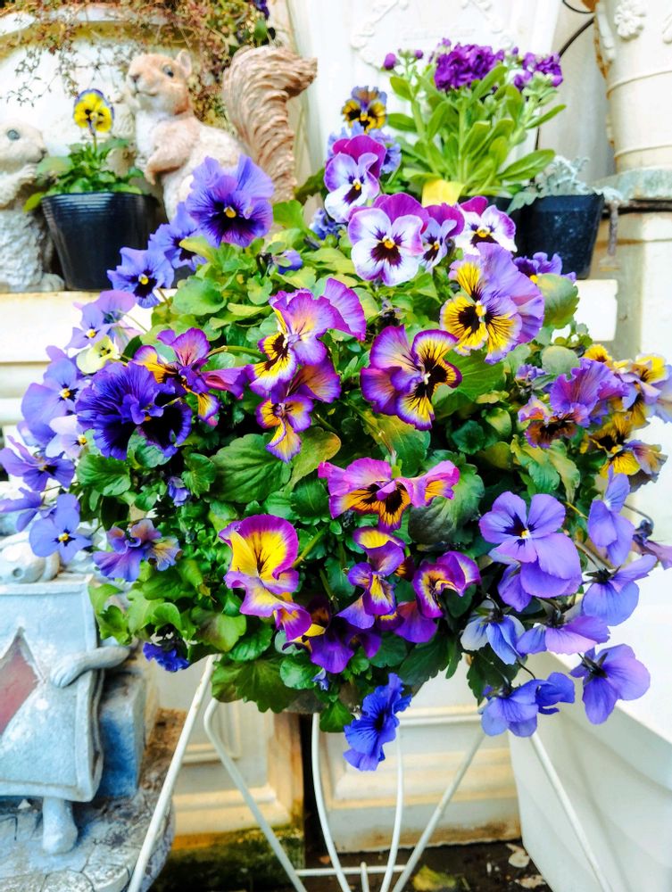 虹色スミレと良く咲くスミレ、ビオラのハンキング🌿作り立てホヤホヤ