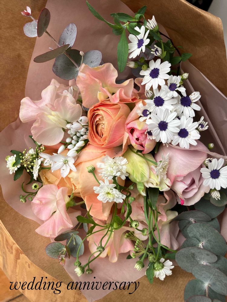 薔薇、スィートピー、サイネリア、マトリカリア、チューリップ🌷など、優しい色のお花にしてもらいました💓