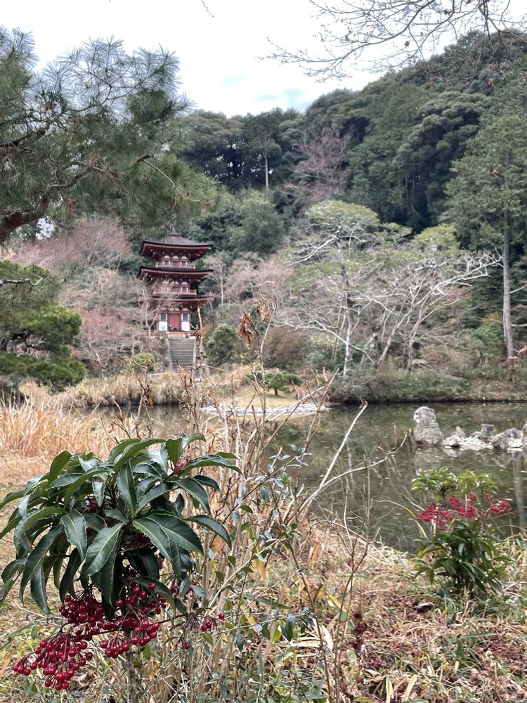 ⑤ マンリョウ(万両)と宝池と三重塔
