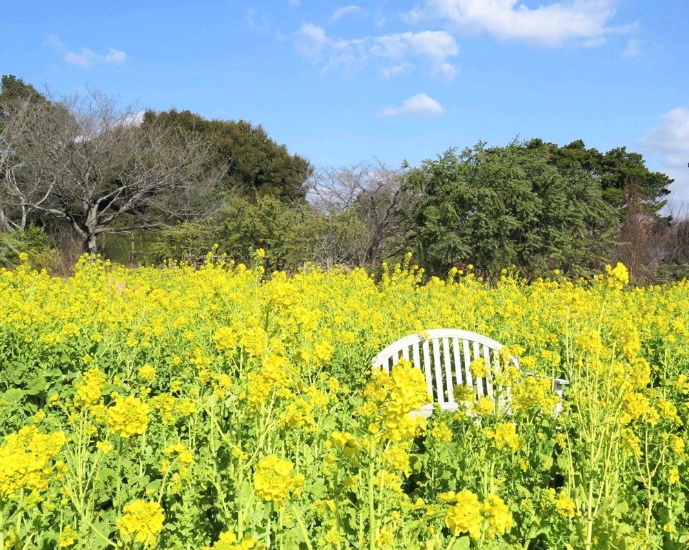 こんにちは、菜の花に囲まれた白いベンチ、素敵ですね💓