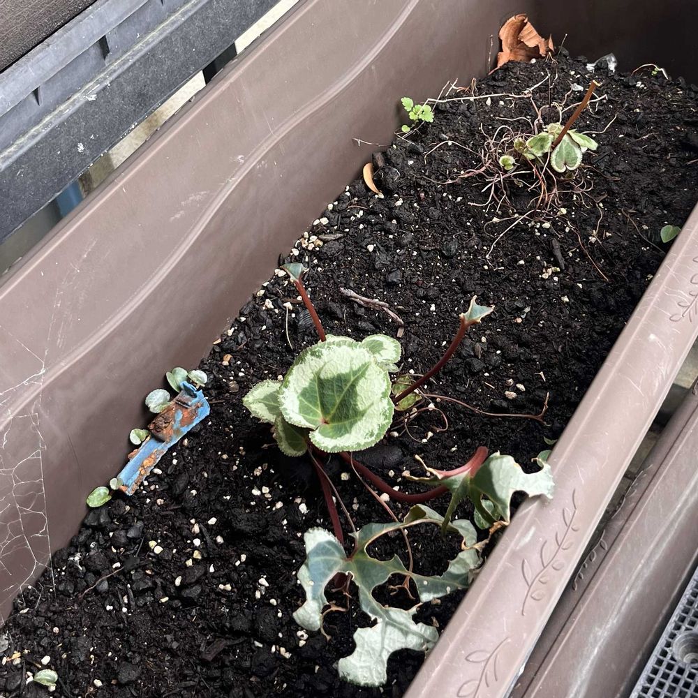 あとシクラメン、写真の左側の水色の破片?の近くに見えてるのはシクラメンの新芽ですか??(ただの興味です🤣)