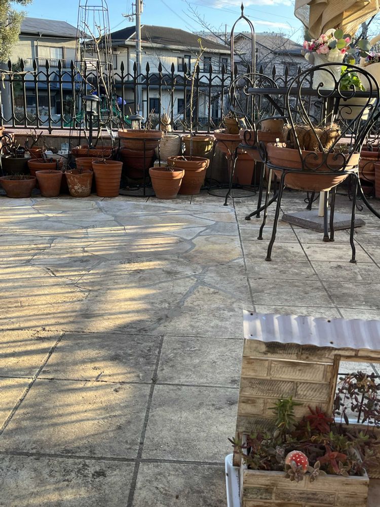 ⑤バラ鉢の植替えが一段落し鉢を並べ直しました。