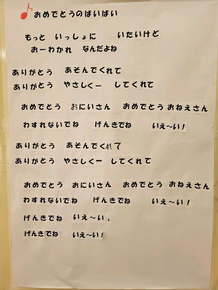 この歌詞を写真に納めていた時、年中クラスの男児が来て「何で写真撮ってるの?」と聞いたので、「とっても良い歌だね、歌ってくれない?」と言ったら、イヤだぁ~って断られました😁🎶