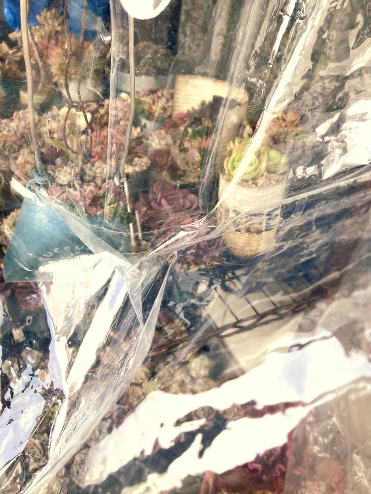 雪対策に屋根のあるテラスに1つ棚と多肉達をせっせと運んでビニールプチプチ不織布〜あるもの全部かけました💦
