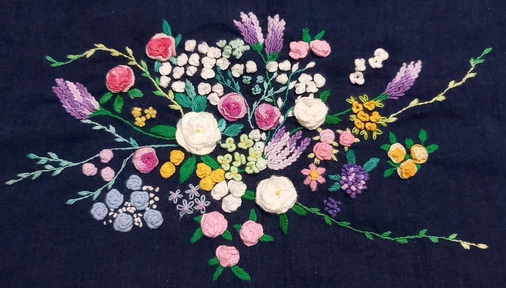 色々あって半年くらいかかりました。下絵もなしでフリーハンドの刺繍です。色のこだわりも花の種類も特に考えずに、その日の気分と手もとにある糸で何となくで進めたので、正解がわかりません。💦😂