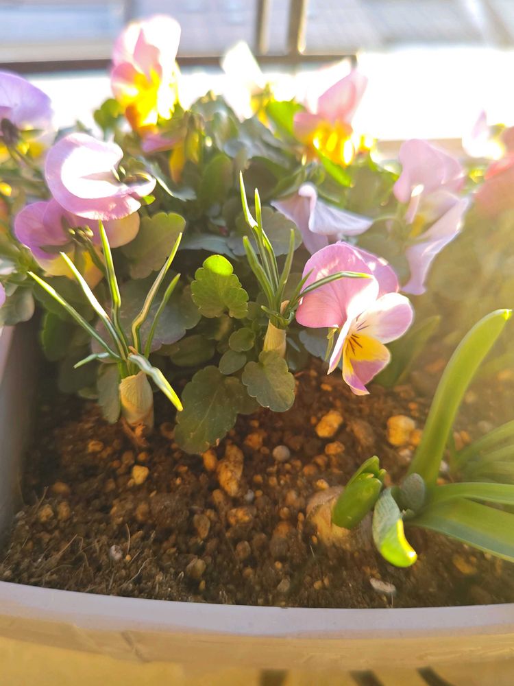 4枚め、今日のお花🏷️のクロッカス。ビオラとムスカリや原種チューリップサマンサ、スノードロップも植えてます。