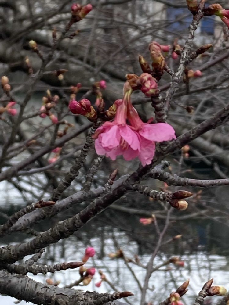 2️⃣二枚目は超早咲きのマンション前のカワヅザクラ。こちらはかなり先進んでいます。