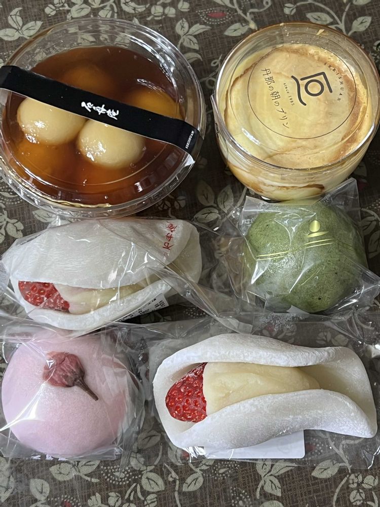 良い花友さんですね 美味しそうな物ばかり😋 苺大福ちょっと変わっていて美味しそうですね😍😆🎶🎶