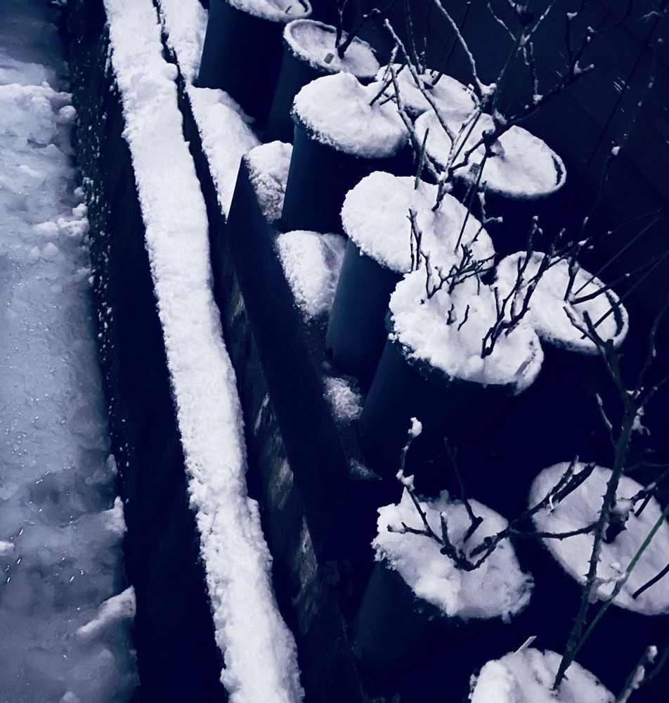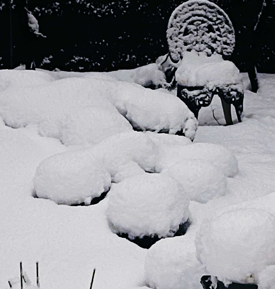 大寒波ラナンキュラスラックスの鉢、埋もれています。2枚目は昨晩の写真。