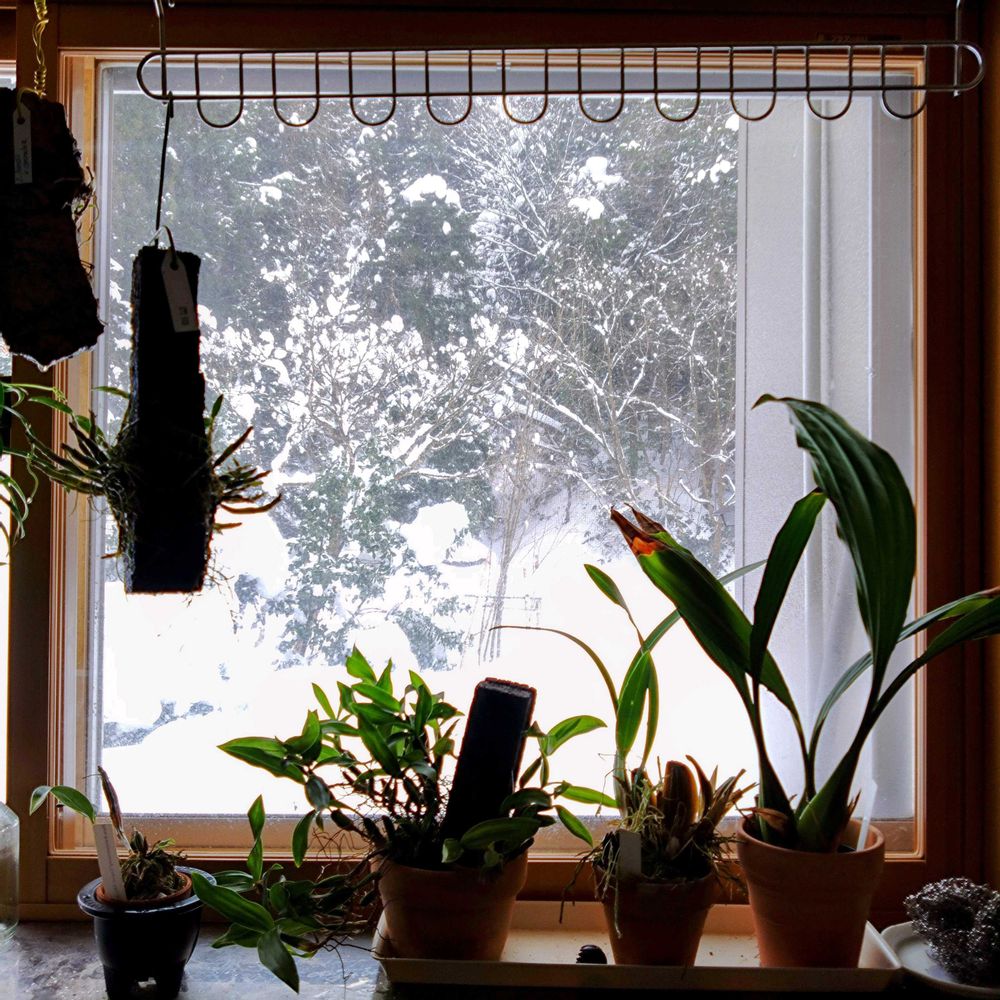 ①②シンクの窓辺に吊るしてるデンドロビウムとミニカトレア。