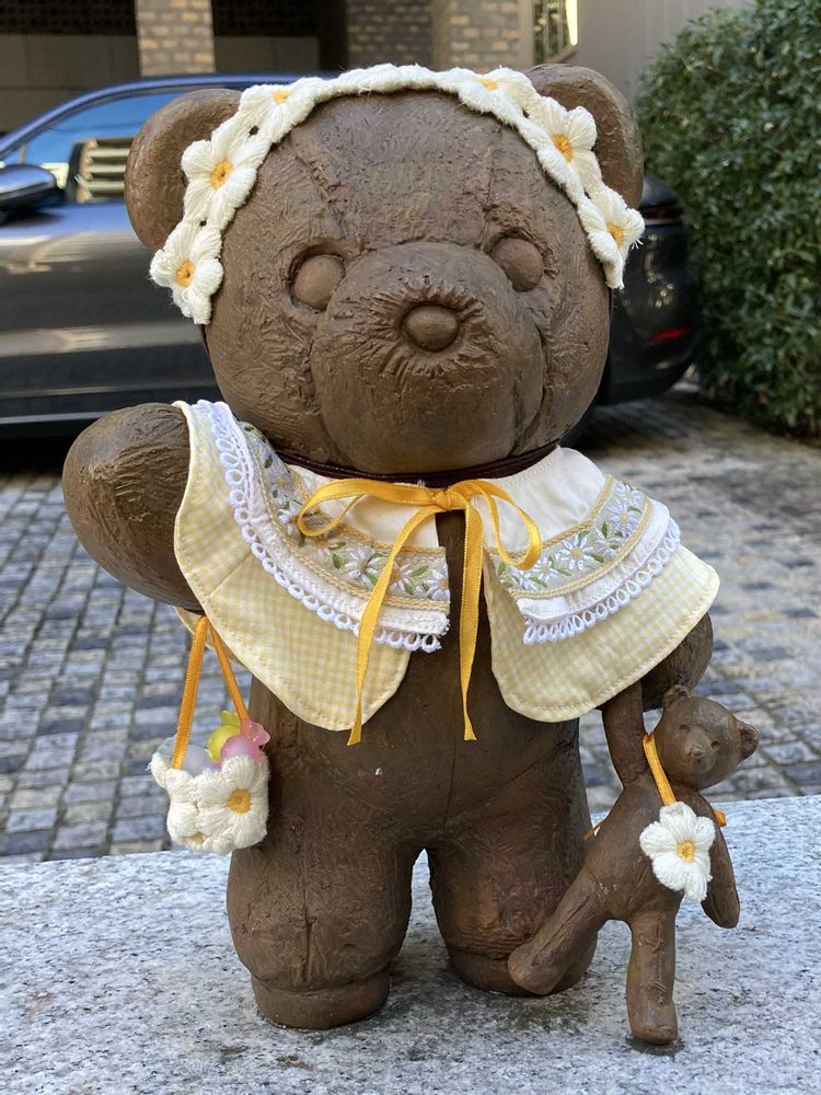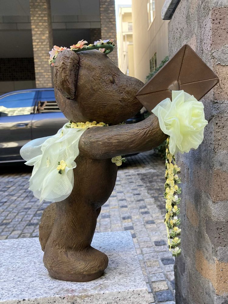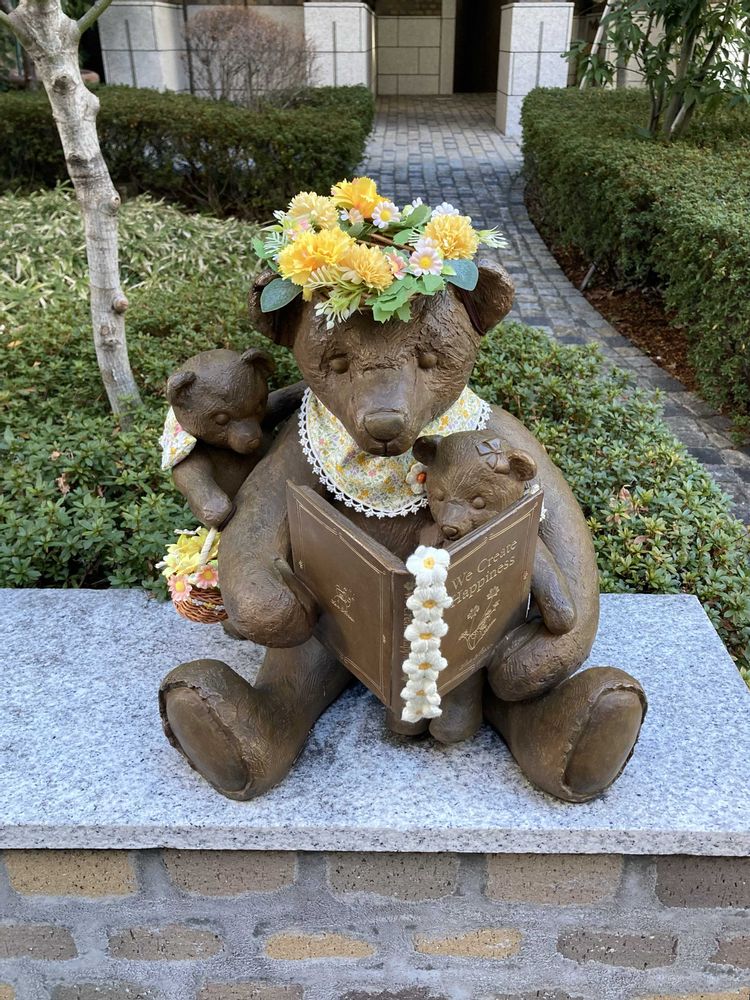 事務所近くのビルのアプローチに飾ってある熊のオブジェに花が添えてあり、あまりにも可愛いので、シャッターを切りました。