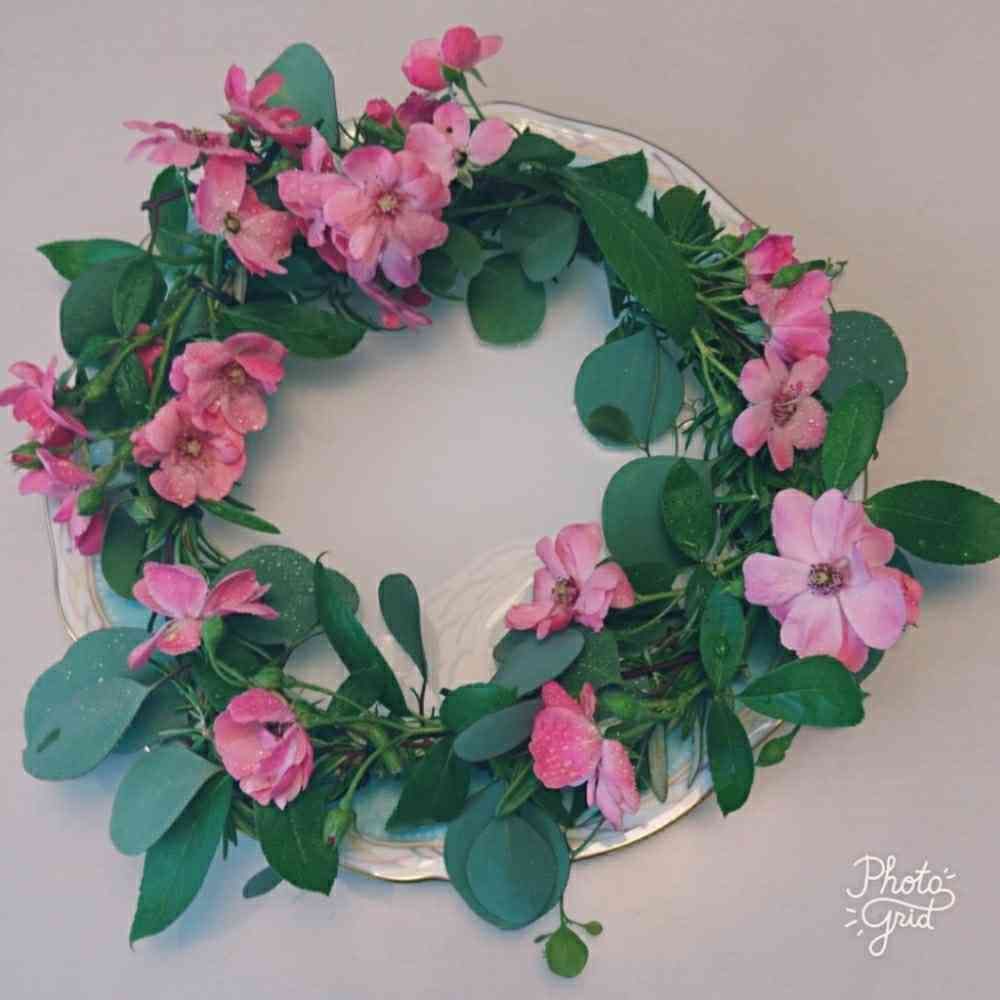 2018,08,16 花遊び。剪定したユーカリポポラス、アンジェラ。ローズマリーを一枝土台にしました。アンジェラが傷んだら外してドライにしよう😊