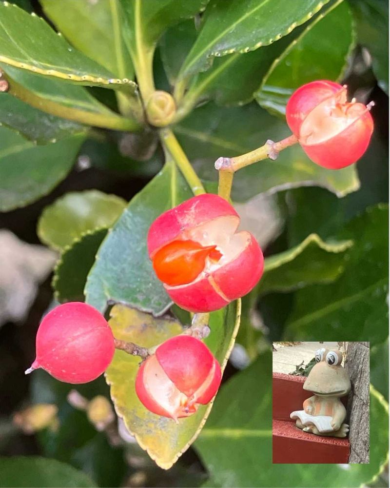 モクレンの蕾,前回より大きく膨らんでいて、マサキの実は弾け、