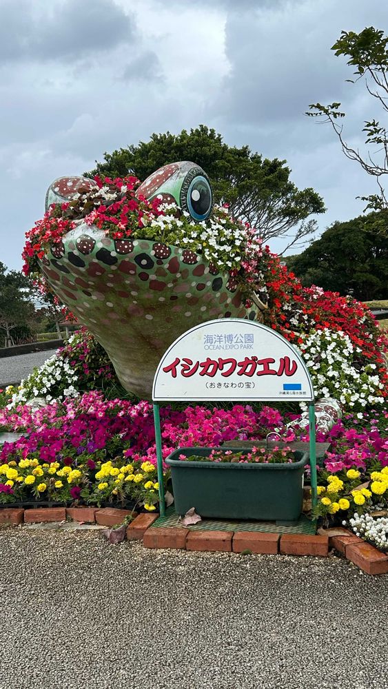 沖縄海洋博公園のお花たちとカエルのオブジェ🐸