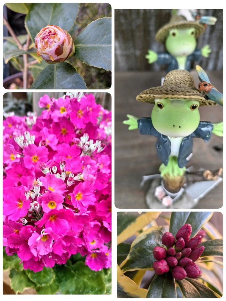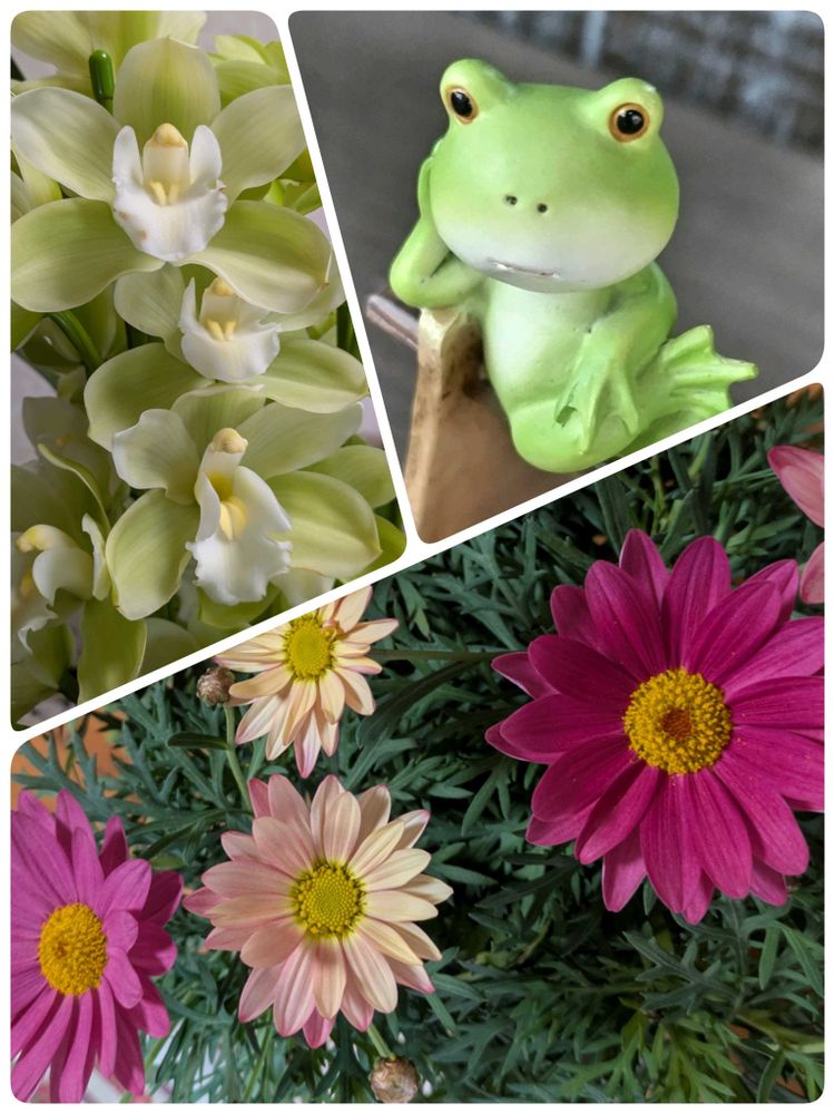 たくさんのお花とユニークなカエルさん🐸に気持ちホッコリです❣️