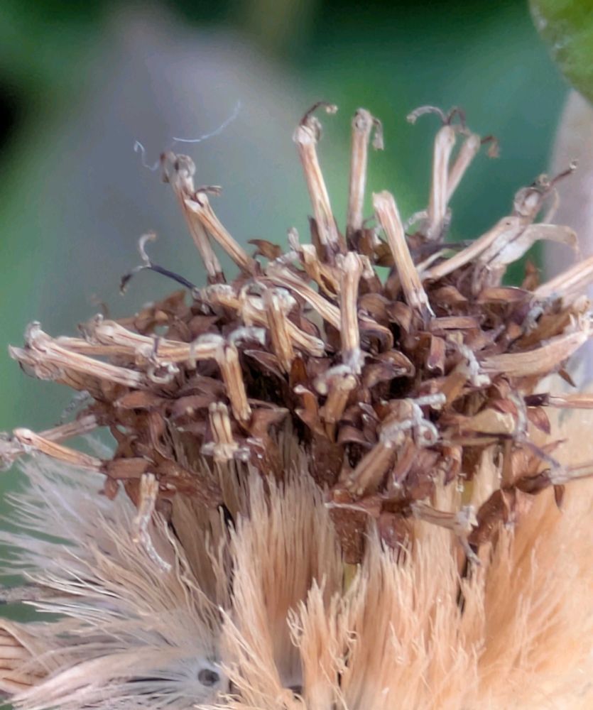 枯れている頭花を横から見ると、舌状花は落ちて、筒状花の冠毛が伸びているのが分かる(´∀`*)