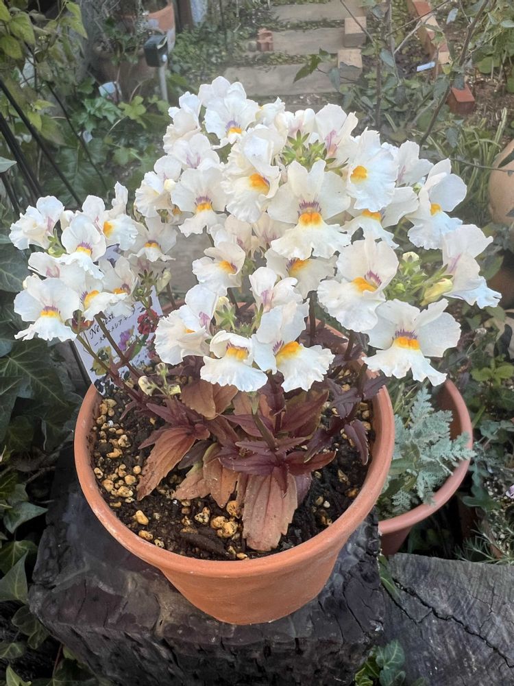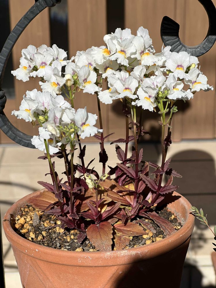ペコちゃんのネメシアって大輪ネメシアネシアって言うの〜🤍✨すくって真っすぐ立ち姿も立派〜流石大輪😍🤍✨🤍✨🤍それに、昨日に、引き続きの銅葉が素敵〜🤎✨