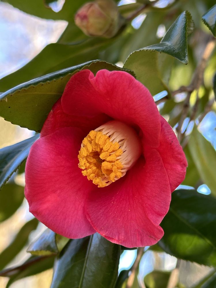 お散歩途中の神社の境内に真っ赤な椿が咲き始めています。
