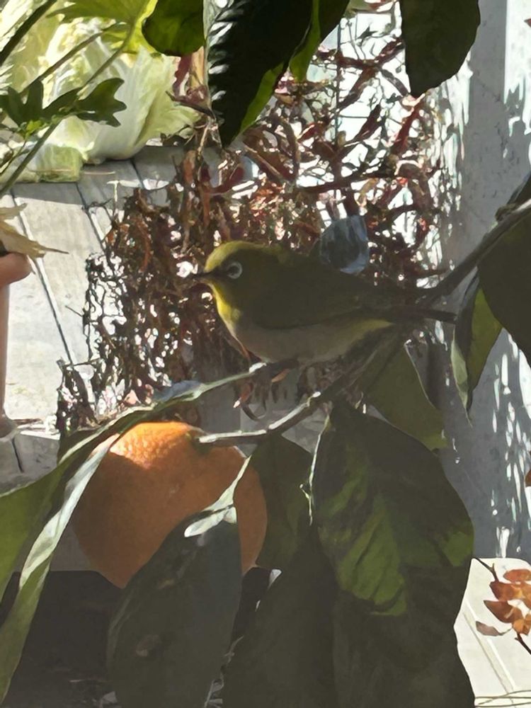 このあと、ヒヨドリが来て狙っているようなので窓🪟叩いたら逃げました💦えこひいき?🤣ふと🍊つついたのはどっが先だったんだろうと思った。明日の朝も来るかしら?下にキウイ🥝置いてみた〜