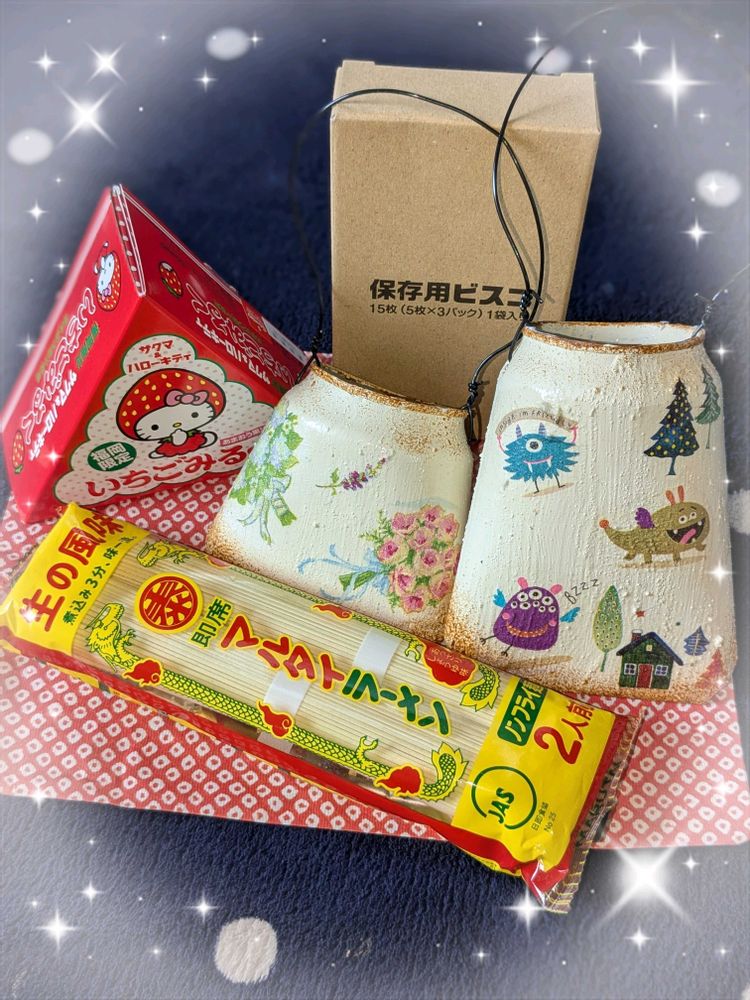 ④mamanyanさんからの素敵便❣️リメ缶バックや福岡の美味しい物😋おくって頂きました🍀(^^ゞ