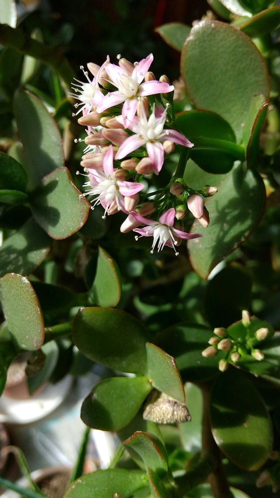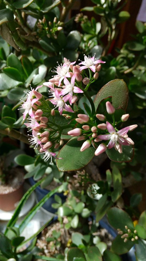 縁側に避難している「金のなる木」。ようやく花が咲いてきました‼️😊今年は この大きい親株だけ咲きそうです。他のたくさんの小株は 蕾はありません。😭