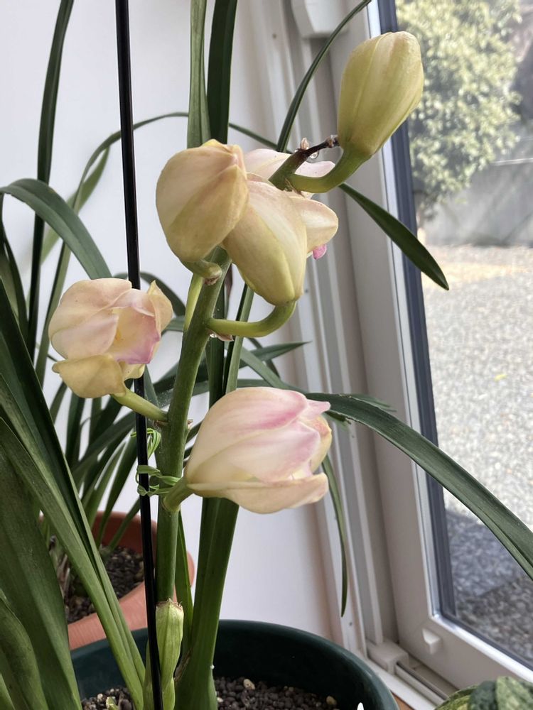 4年ぶりに花芽を付けたシンビジウムが開き始めました