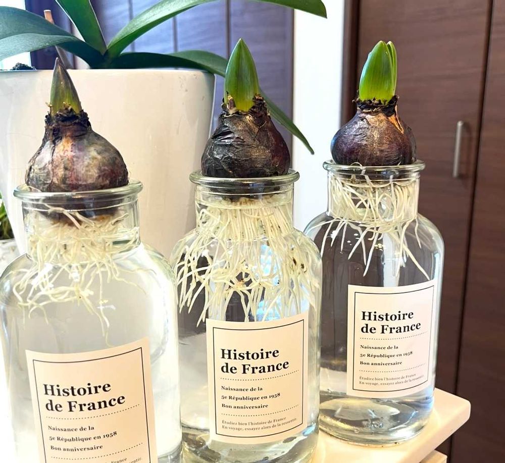2枚目は、フォロワーさんに教えて頂いた百均のガラス瓶🫙でヒヤシンスの水耕栽培始めました🪻