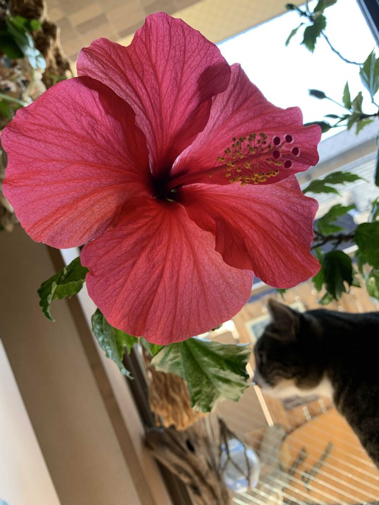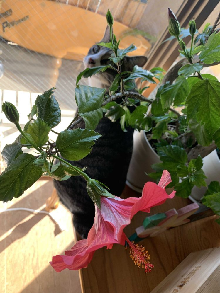 ハイビスカス🌺元気にさいてますね🥰本当にかわいい色です。🐱プアちゃんとハイビスカス🌺の写真が可愛くて癒されます😆💕うちのハイビスカスは疲れて来たのか蕾もあまり出なくなり咲いてもかなり小ぶりになって来たので剪定✂️してしまいました‼️なんか寂しいなぁと😅水差しして根っこ出たら鉢に植え替えようと☝️この時期にやる事ではないかもですが💦増やしたいです🤭🎶心配しながらも毎日見守ってます。暫くはゆうちゃんさんのハイビスカス🌺みて癒されます(ू>ω<ू❁)💕