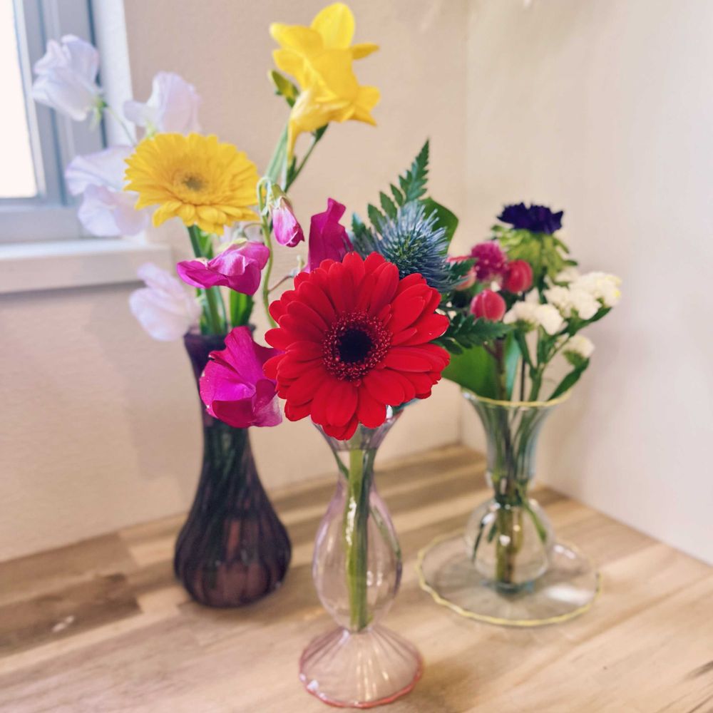 冬は切り花が長持ち。小さなフラワーベースをたくさん並べるのもにぎやかでかわいいかも!