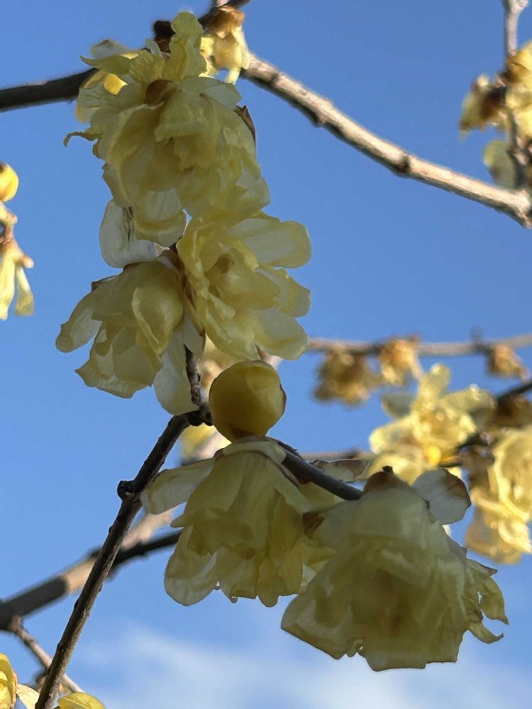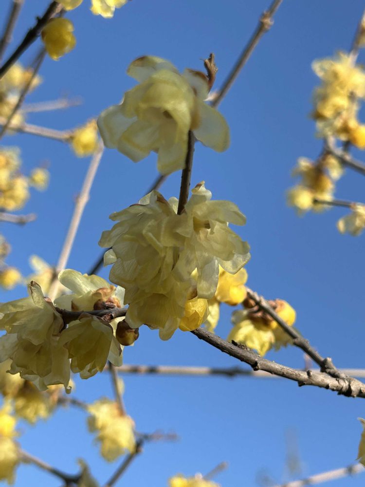 青空に、ロウバイの黄色い花が映えて、本当に綺麗です✿゚❀.(*´▽`*)❀.゚✿