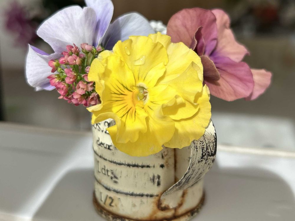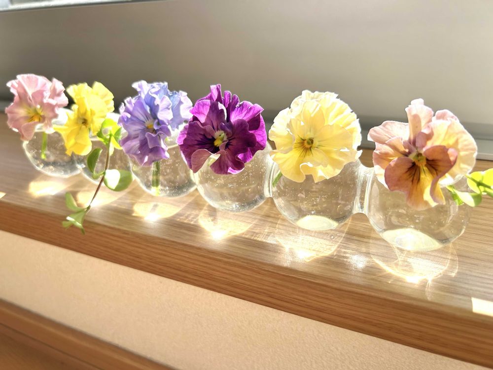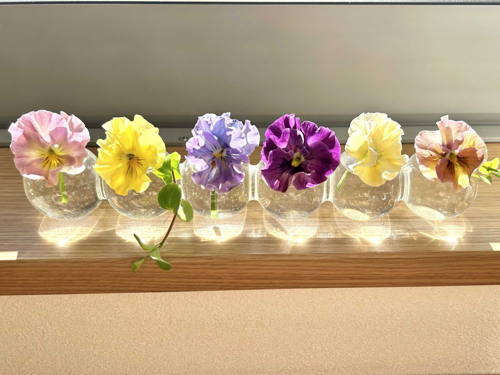 久しぶりにお気に入りの6連の花瓶にビオラやパンジーを飾ってみました🌼🌸🌿