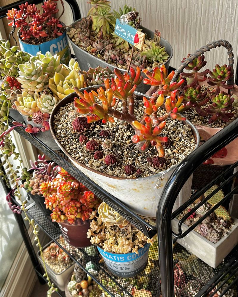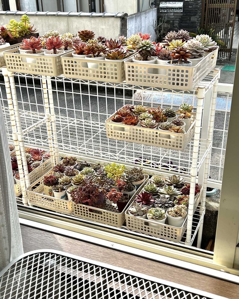 部屋の腰窓と外の多肉棚の距離が近くて良かった‼︎腰窓から手伸ばしてカゴの出し入れしてます😆👍