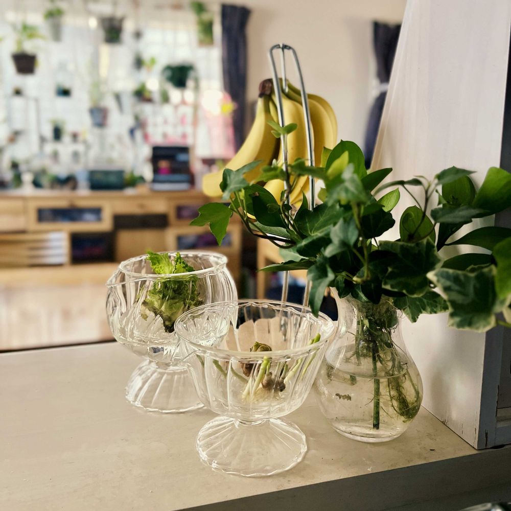 料理で出た芯を、これは育てられるかな?と本で調べながら、リボベジガラスで水に浸けています。