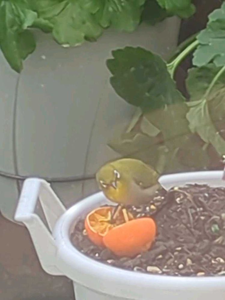 メジロさんも今朝早く雪の中を来てくれましたが🍊が雪に埋まっていて叫んでました「🍊❄️‼️🦜💥」