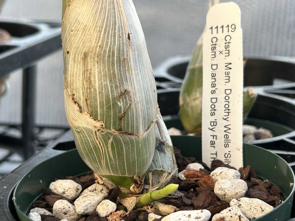 SVO11119 Ctsm. Mem. Dorothy Wells 'Silver & Gold' x Ctsm. Diana's Dots 'By Far the Best'にまたまた変化🧐 花芽?葉芽? 自分の感覚的には花芽の可能性が高いような気がします🌸