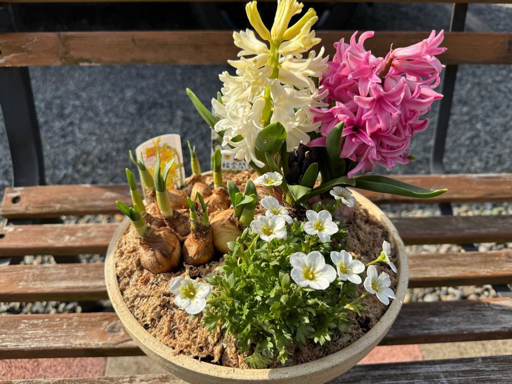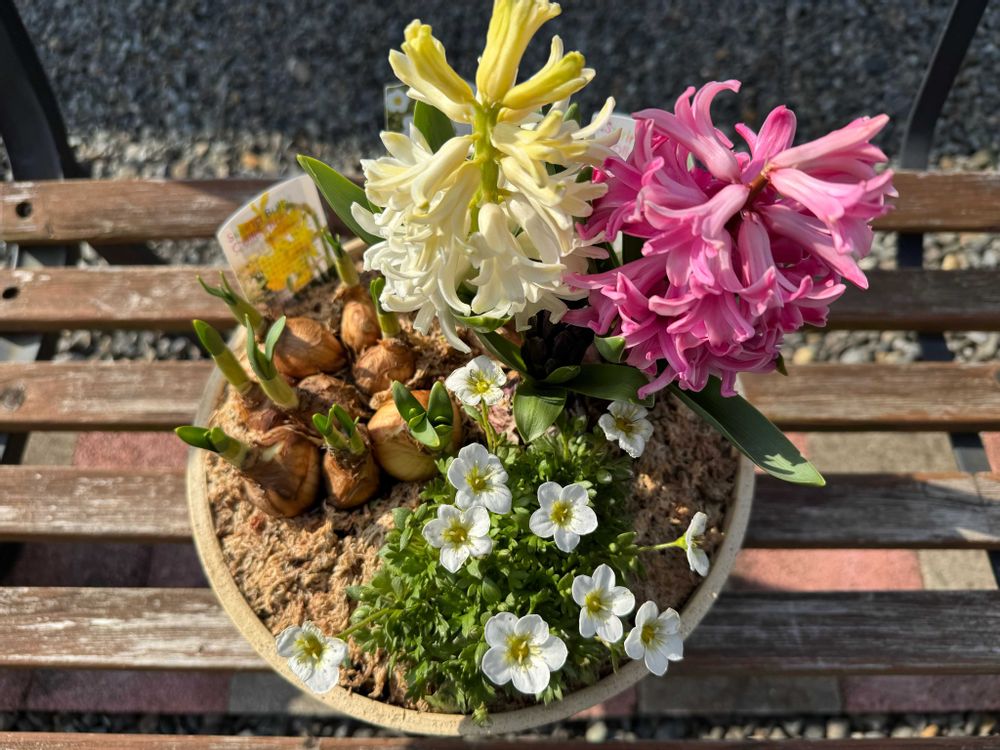 雲間草のラージホワイトと一緒に寄せ植えにしましたよ。 パープルのヒヤシンスとスイセンがまだなのでこれからが楽しみです😊